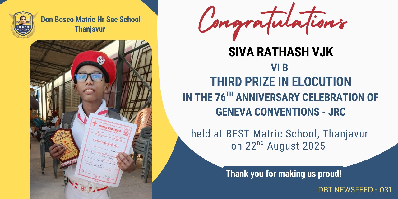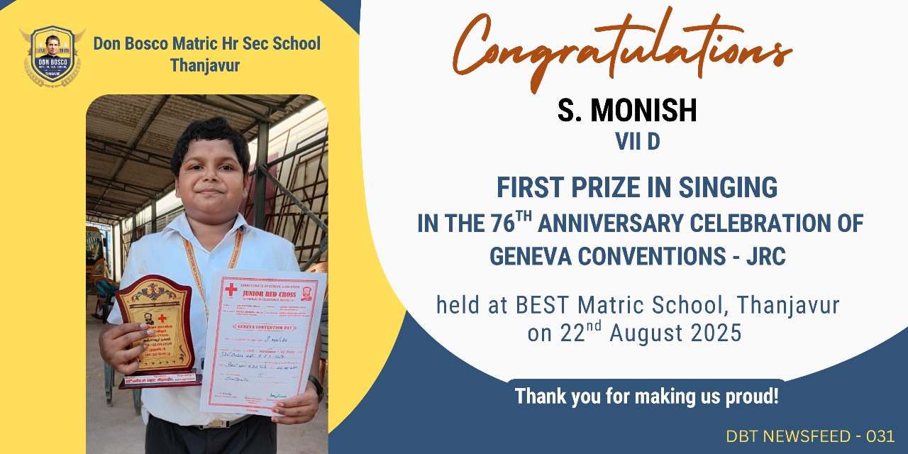 S. MONISH of class VII won FIRST Prize in Singing and SIVA RATHASH NJK of class VI won THIRD Prize in Elocution competitions in the 76th Anniversary celebration of GENEVA CONVENTIONS - JRC