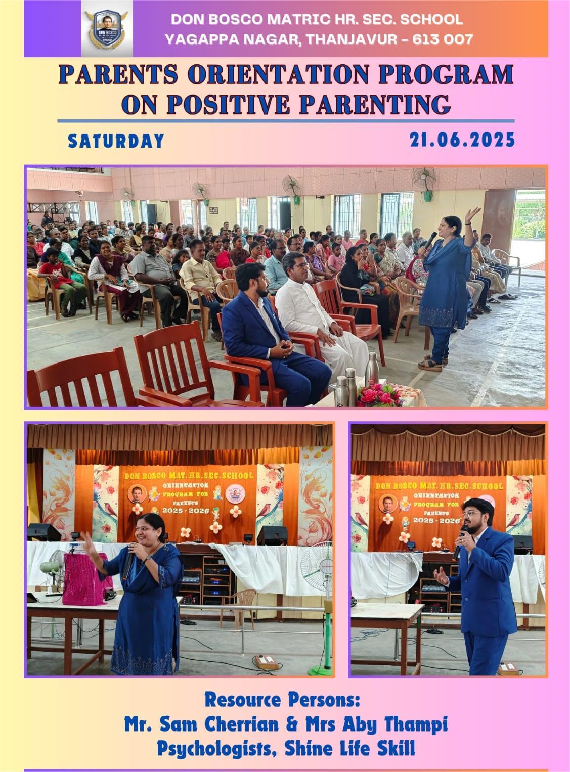 ORIENTATION PROGRAM ON POSITIVE PARENTING BY MR. SAM CHERRIAN AND MRS. ABY THAMPI, PSYCHOLOGISTS, SHINE LIFE SKILLS. A WONDERFUL SESSION THAT HELPS PARENTS TO BUILD A HAPPY AND POSITIVE PARENTING WITH THEIR CHILDREN.